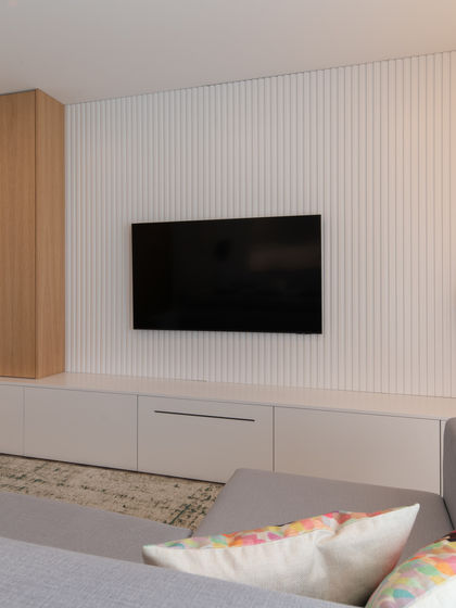 Na sala, o mobiliário feito à medida organiza o espaço e valoriza a parede de destaque, marcada por um ripado vertical na cor branca que acrescenta ritmo e textura. A paleta de cinzas e brancos ganha suavidade através dos apontamentos de cor nos têxteis e nos elementos decorativos, criando um equilíbrio subtil entre simplicidade e conforto.